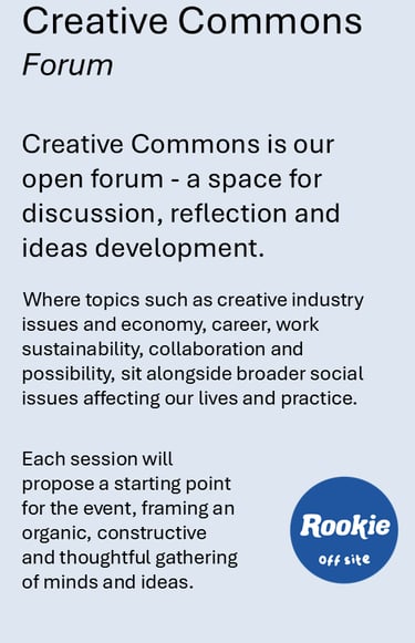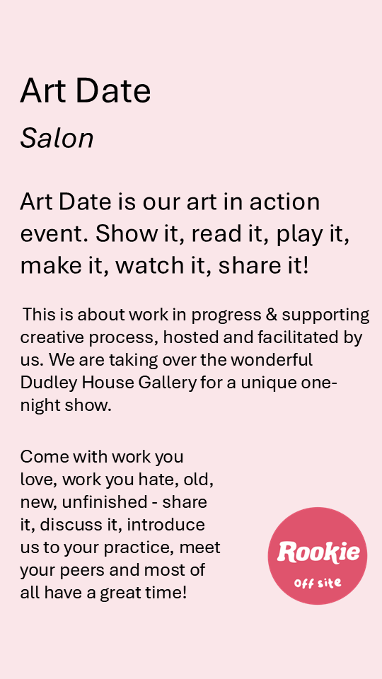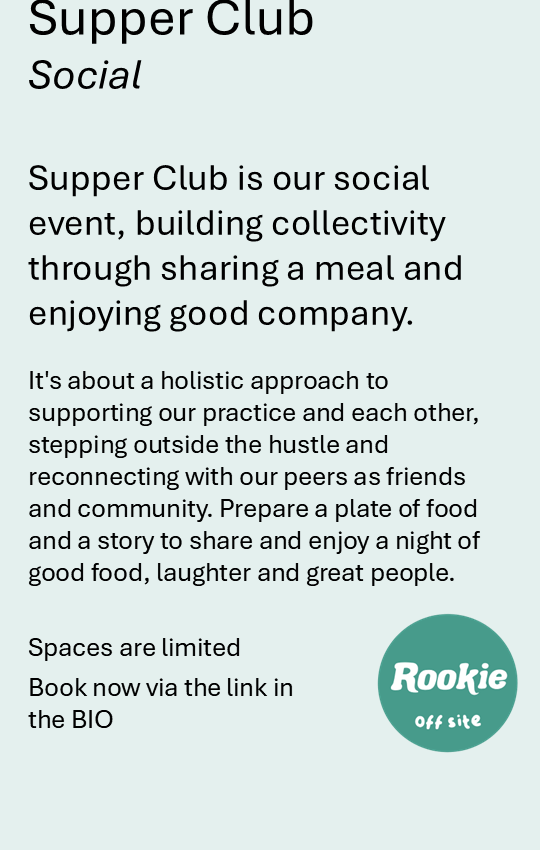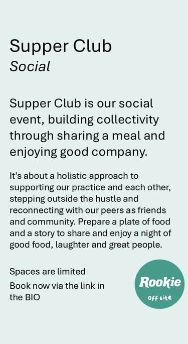 After 4 years in operation and a hugely successful festival in 2024, we took time out in 2025 to reflect on the changing needs of artists, art workers and our loyal supporters. Now, we’re excited to return with a fresh approach and renewed energy through our experimental new project: Rookie Off Site. Off Site is a series of events which will enliven, engage and support your creative process and practice. We want to support creative practice through focusing on the process not just the product. Outside the box has become our mission statement to explore new ways of working as artists and artworkers and to rethink our offering to our supporters and the public. We have developed a series of events to foster and support all types of creative practice, community and engagement. Rookie Off Site is a series of events designed for creative practitioners by practicing artists and art workers Jac Hartje and Annelise Henderson. If you are interested in supporting or hosting these events, please reach out - we will be touring this series and may be coming to a location near you soon.